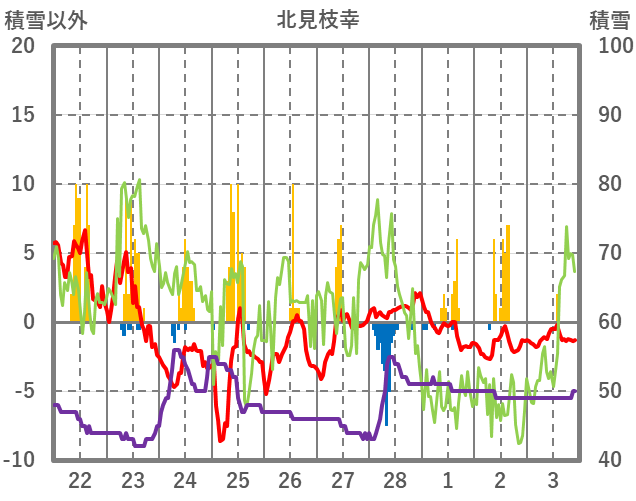 | 日 | 時 | 気温 | 降水 | 風向/風速 | 日照 | 積雪 | 降雪 |