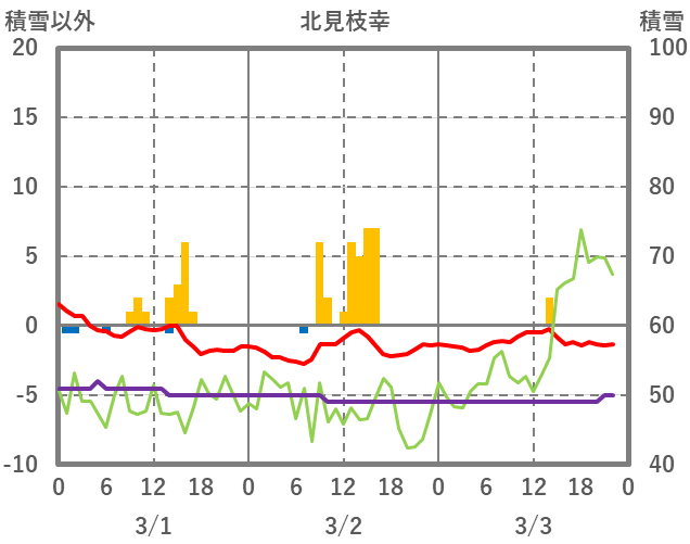 | 日 | 時 | 気温 | 降水 | 風向/風速 | 日照 | 積雪 | 降雪 |