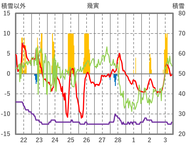 | 日 | 時 | 気温 | 降水 | 風向/風速 | 日照 | 積雪 | 降雪 |