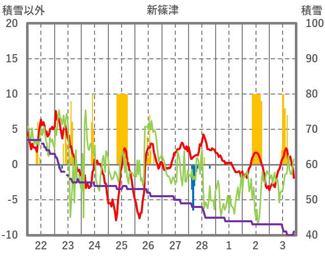 | 日 | 時 | 気温 | 降水 | 風向/風速 | 日照 | 積雪 | 降雪 |