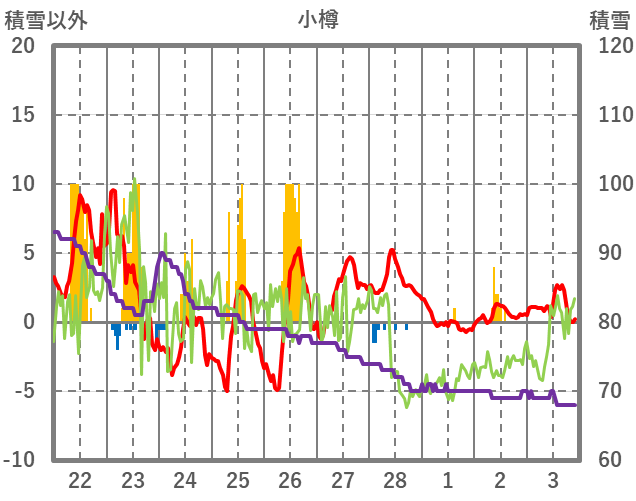 | 日 | 時 | 気温 | 降水 | 風向/風速 | 日照 | 積雪 | 降雪 |
