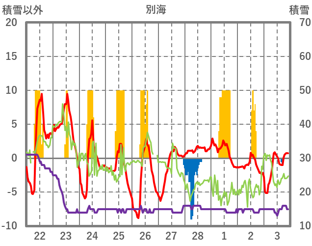 | 日 | 時 | 気温 | 降水 | 風向/風速 | 日照 | 積雪 | 降雪 |