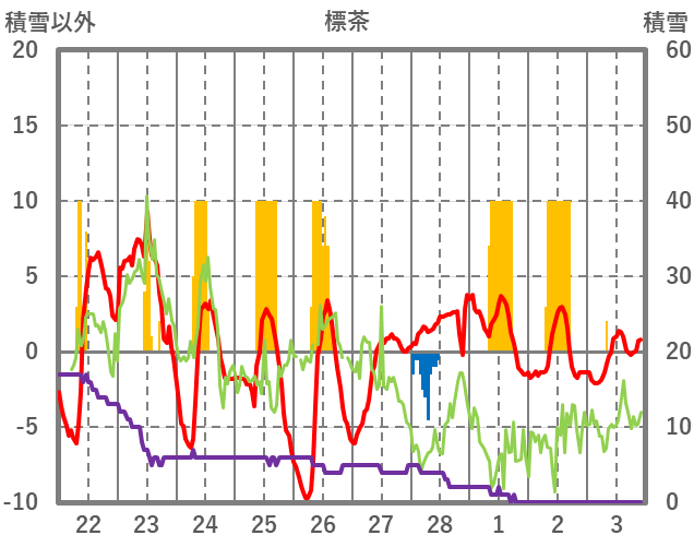 | 日 | 時 | 気温 | 降水 | 風向/風速 | 日照 | 積雪 | 降雪 |