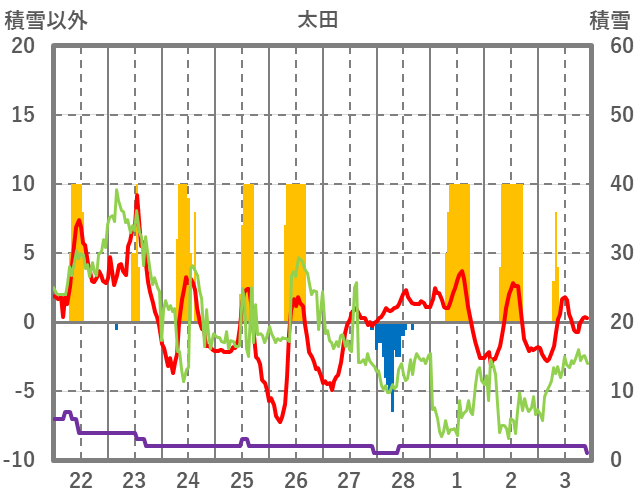 | 日 | 時 | 気温 | 降水 | 風向/風速 | 日照 | 積雪 | 降雪 |