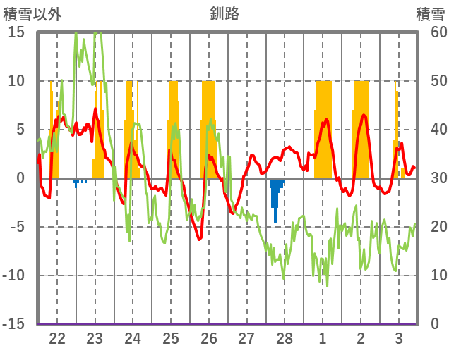 | 日 | 時 | 気温 | 降水 | 風向/風速 | 日照 | 積雪 | 降雪 |
