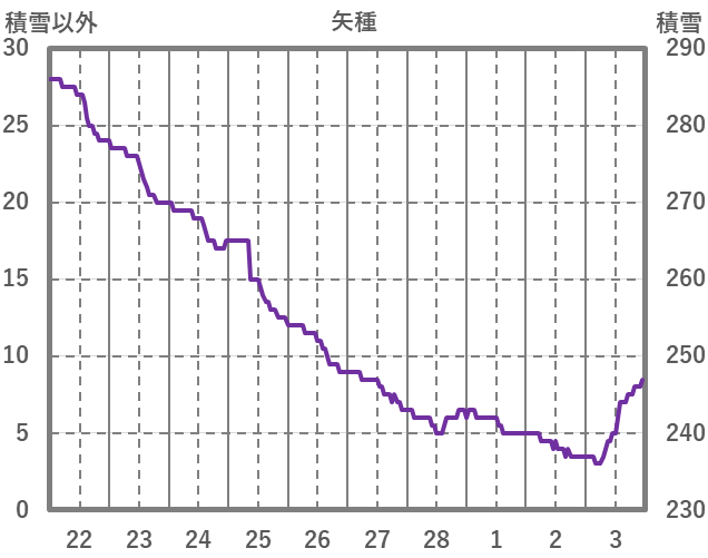 | 日 | 時 | 気温 | 降水 | 風向/風速 | 日照 | 積雪 | 降雪 |