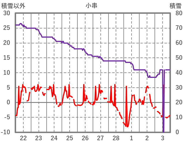 | 日 | 時 | 気温 | 降水 | 風向/風速 | 日照 | 積雪 | 降雪 |