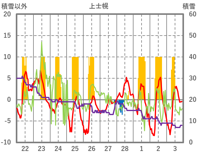 | 日 | 時 | 気温 | 降水 | 風向/風速 | 日照 | 積雪 | 降雪 |