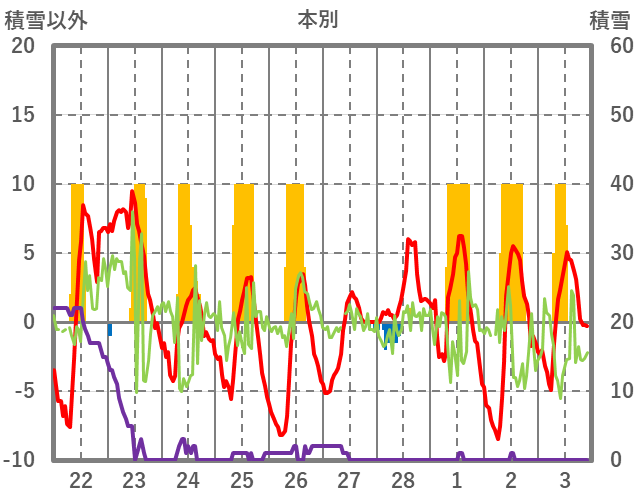 | 日 | 時 | 気温 | 降水 | 風向/風速 | 日照 | 積雪 | 降雪 |