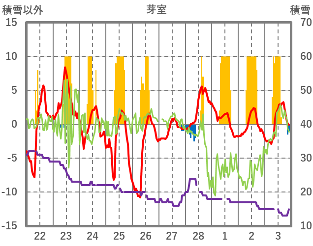 | 日 | 時 | 気温 | 降水 | 風向/風速 | 日照 | 積雪 | 降雪 |