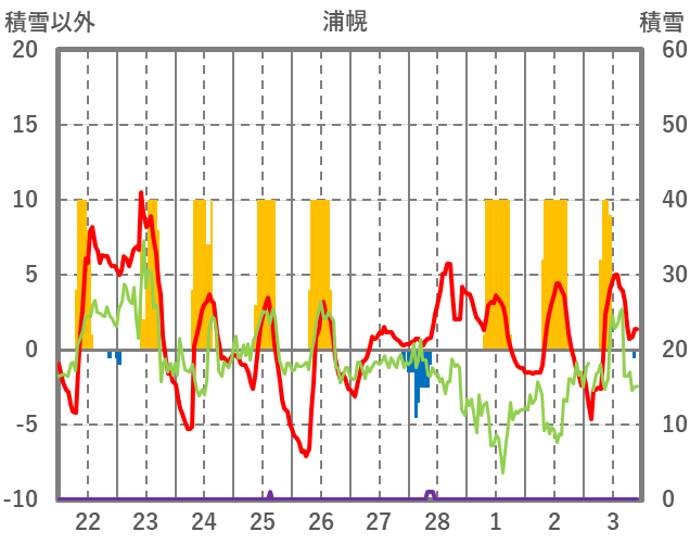 | 日 | 時 | 気温 | 降水 | 風向/風速 | 日照 | 積雪 | 降雪 |