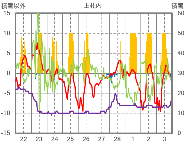 | 日 | 時 | 気温 | 降水 | 風向/風速 | 日照 | 積雪 | 降雪 |