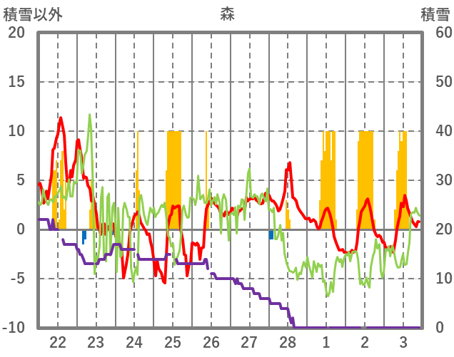 | 日 | 時 | 気温 | 降水 | 風向/風速 | 日照 | 積雪 | 降雪 |