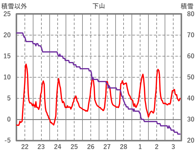 | 日 | 時 | 気温 | 降水 | 風向/風速 | 日照 | 積雪 | 降雪 |