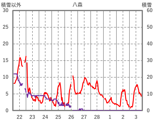 | 日 | 時 | 気温 | 降水 | 風向/風速 | 日照 | 積雪 | 降雪 |