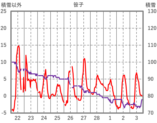 | 日 | 時 | 気温 | 降水 | 風向/風速 | 日照 | 積雪 | 降雪 |