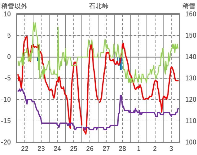| 日 | 時 | 気温 | 降水 | 風向/風速 | 日照 | 積雪 | 降雪 |