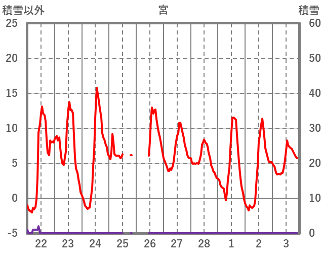 | 日 | 時 | 気温 | 降水 | 風向/風速 | 日照 | 積雪 | 降雪 |