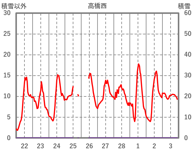 | 日 | 時 | 気温 | 降水 | 風向/風速 | 日照 | 積雪 | 降雪 |