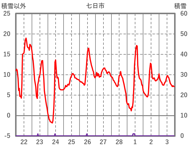 | 日 | 時 | 気温 | 降水 | 風向/風速 | 日照 | 積雪 | 降雪 |