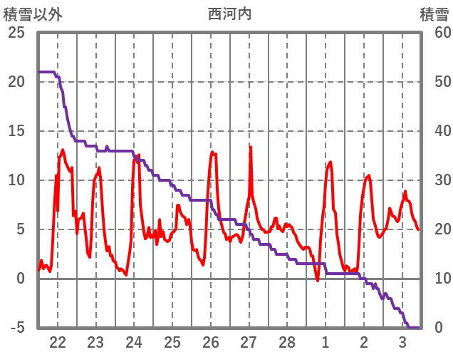| 日 | 時 | 気温 | 降水 | 風向/風速 | 日照 | 積雪 | 降雪 |