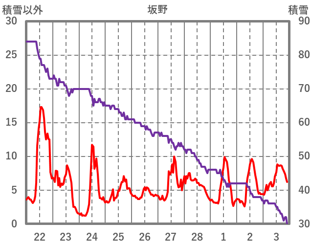 | 日 | 時 | 気温 | 降水 | 風向/風速 | 日照 | 積雪 | 降雪 |