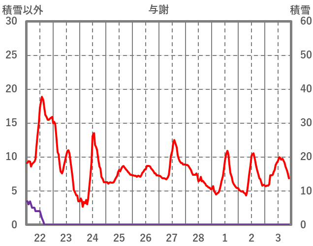 | 日 | 時 | 気温 | 降水 | 風向/風速 | 日照 | 積雪 | 降雪 |