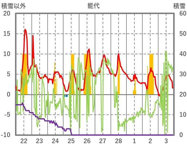 | 日 | 時 | 気温 | 降水 | 風向/風速 | 日照 | 積雪 | 降雪 |