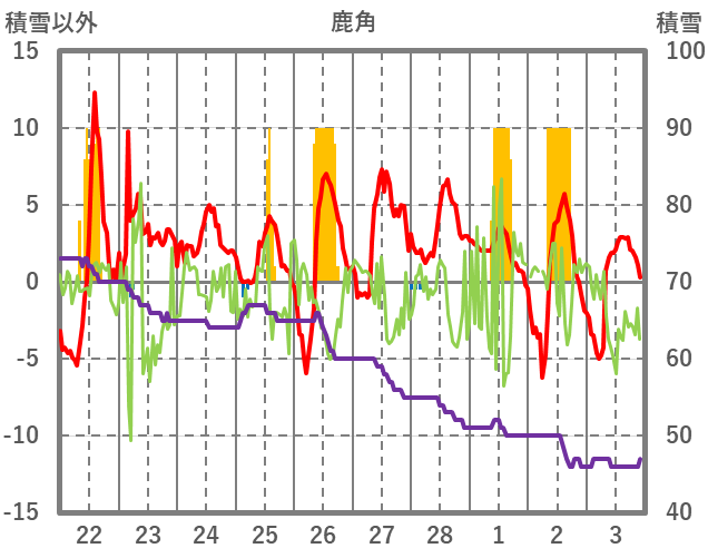 | 日 | 時 | 気温 | 降水 | 風向/風速 | 日照 | 積雪 | 降雪 |