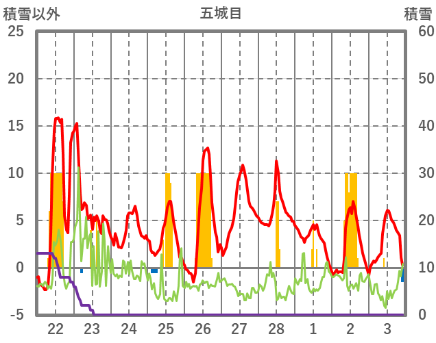 | 日 | 時 | 気温 | 降水 | 風向/風速 | 日照 | 積雪 | 降雪 |