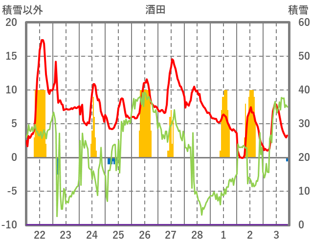 | 日 | 時 | 気温 | 降水 | 風向/風速 | 日照 | 積雪 | 降雪 |