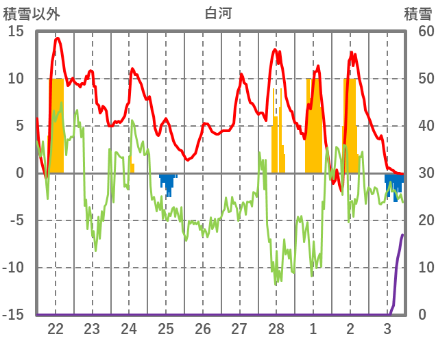 | 日 | 時 | 気温 | 降水 | 風向/風速 | 日照 | 積雪 | 降雪 |
