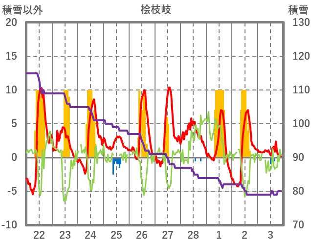 | 日 | 時 | 気温 | 降水 | 風向/風速 | 日照 | 積雪 | 降雪 |