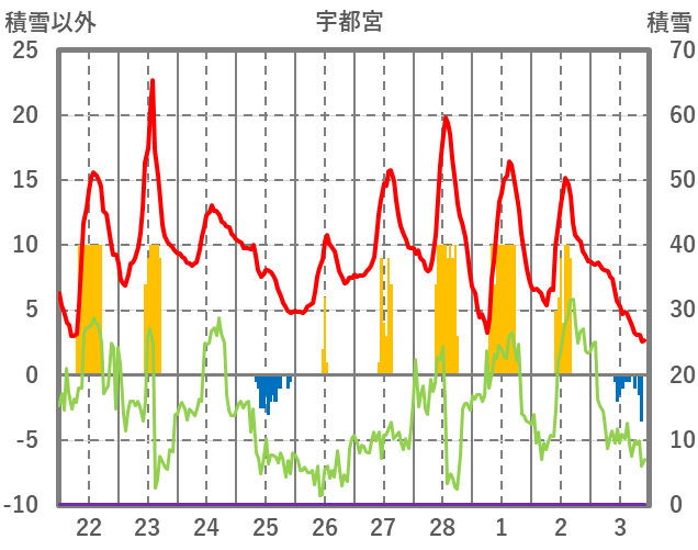 | 日 | 時 | 気温 | 降水 | 風向/風速 | 日照 | 積雪 | 降雪 |
