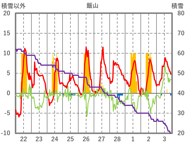 | 日 | 時 | 気温 | 降水 | 風向/風速 | 日照 | 積雪 | 降雪 |