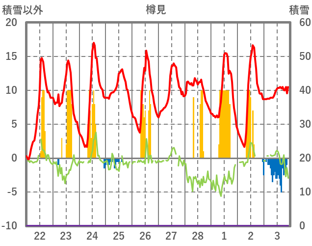 | 日 | 時 | 気温 | 降水 | 風向/風速 | 日照 | 積雪 | 降雪 |