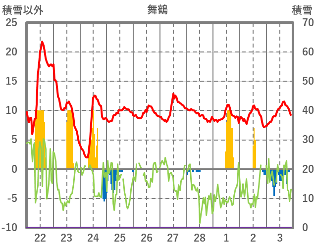 | 日 | 時 | 気温 | 降水 | 風向/風速 | 日照 | 積雪 | 降雪 |