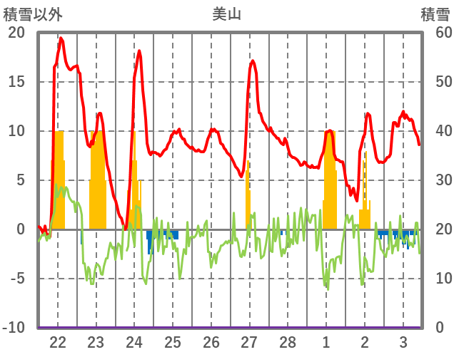 | 日 | 時 | 気温 | 降水 | 風向/風速 | 日照 | 積雪 | 降雪 |