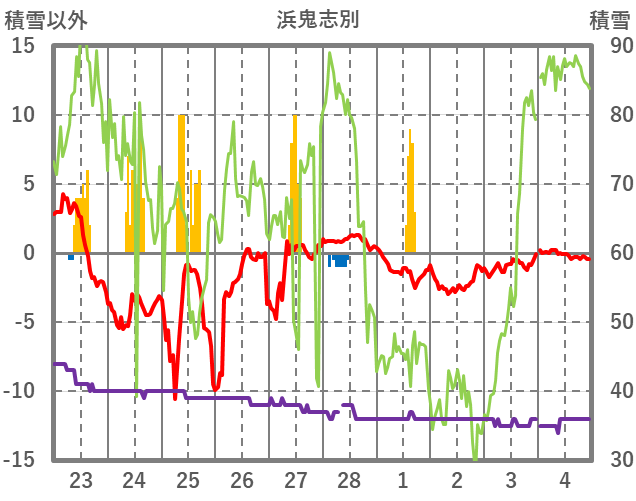 | 日 | 時 | 気温 | 降水 | 風向/風速 | 日照 | 積雪 | 降雪 |