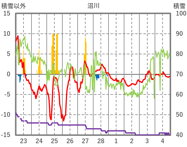 | 日 | 時 | 気温 | 降水 | 風向/風速 | 日照 | 積雪 | 降雪 |