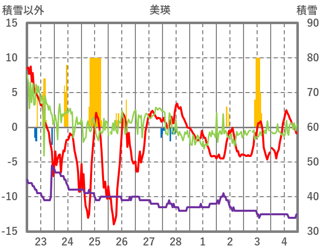 | 日 | 時 | 気温 | 降水 | 風向/風速 | 日照 | 積雪 | 降雪 |