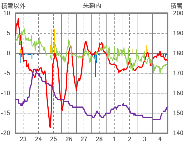 | 日 | 時 | 気温 | 降水 | 風向/風速 | 日照 | 積雪 | 降雪 |