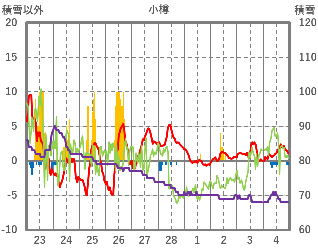 | 日 | 時 | 気温 | 降水 | 風向/風速 | 日照 | 積雪 | 降雪 |
