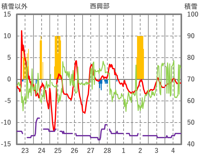 | 日 | 時 | 気温 | 降水 | 風向/風速 | 日照 | 積雪 | 降雪 |