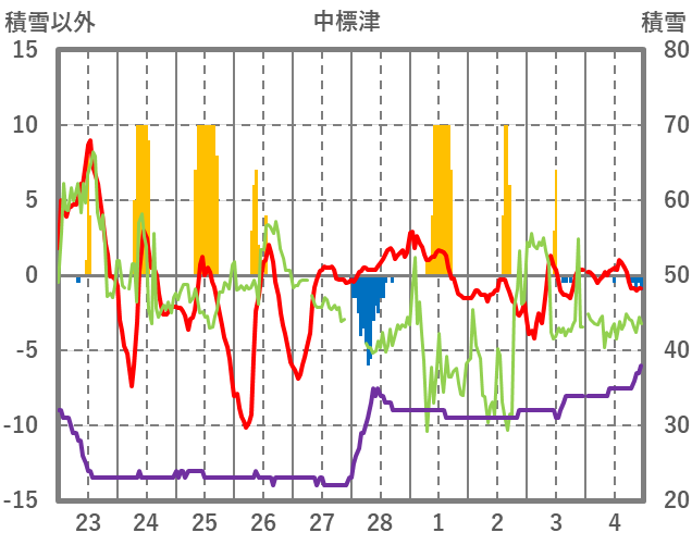 | 日 | 時 | 気温 | 降水 | 風向/風速 | 日照 | 積雪 | 降雪 |