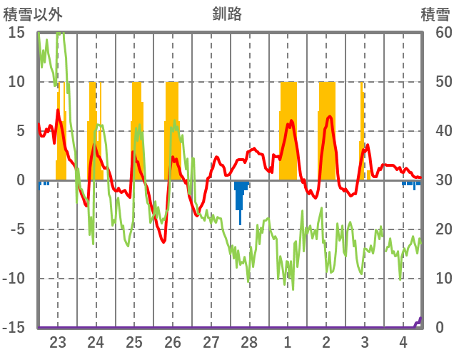 | 日 | 時 | 気温 | 降水 | 風向/風速 | 日照 | 積雪 | 降雪 |