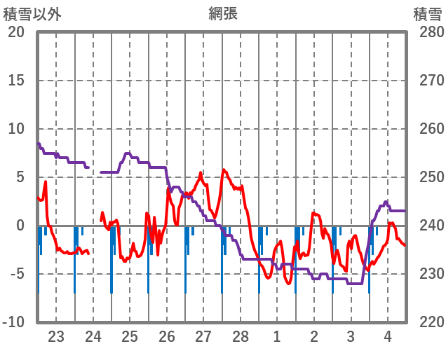 | 日 | 時 | 気温 | 降水 | 風向/風速 | 日照 | 積雪 | 降雪 |