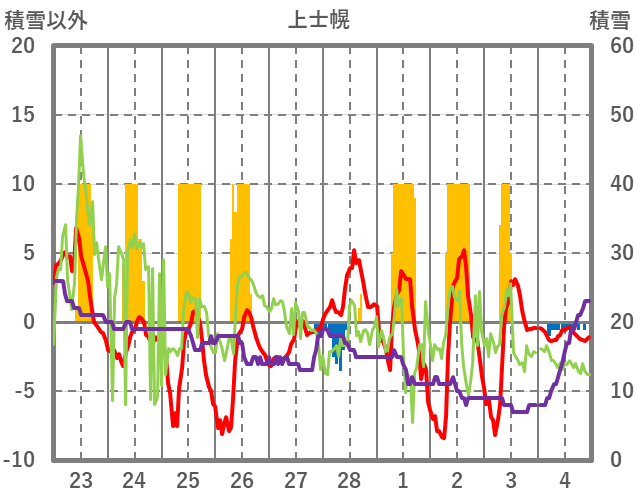 | 日 | 時 | 気温 | 降水 | 風向/風速 | 日照 | 積雪 | 降雪 |