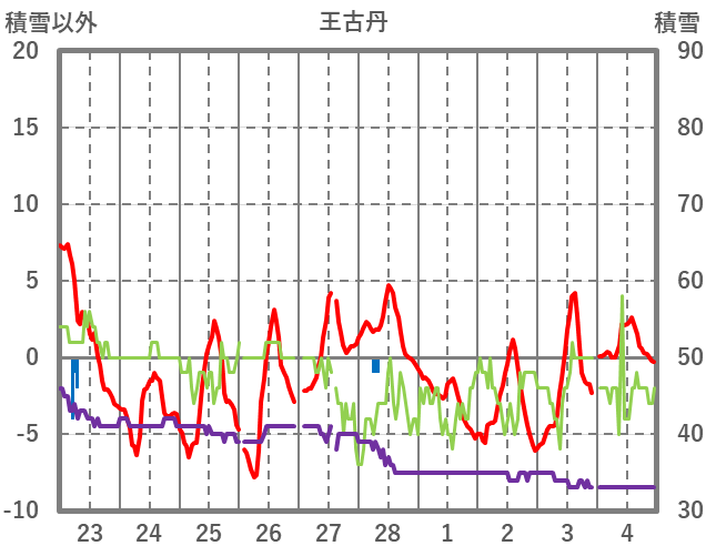 | 日 | 時 | 気温 | 降水 | 風向/風速 | 日照 | 積雪 | 降雪 |