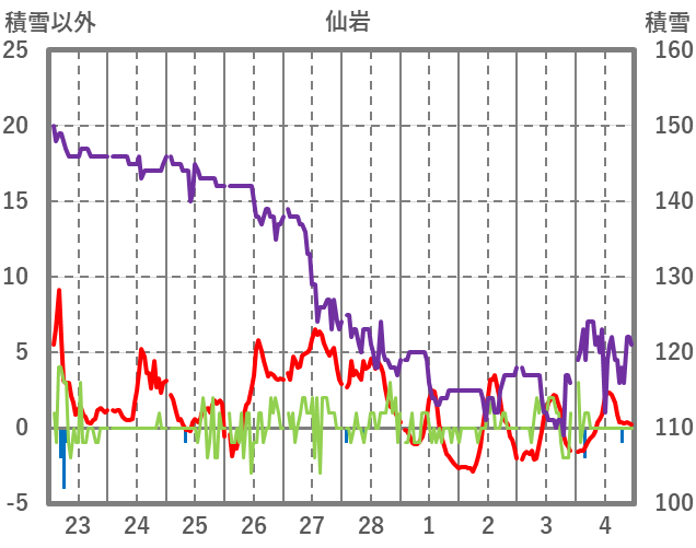 | 日 | 時 | 気温 | 降水 | 風向/風速 | 日照 | 積雪 | 降雪 |
